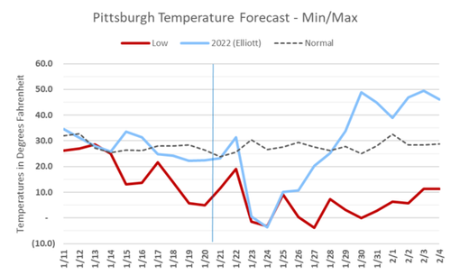 We overlaid the Pittsburgh, PA low temperatures during Winter Storm Elliott (2022) with the coming cold shot, and the 1/30 cold event has similar overnight lows on 1/23-1/24. However, the cold lingers long after that versus the rapid warming seen during Elliot that propelled averages back into the 40-50F range within a week.