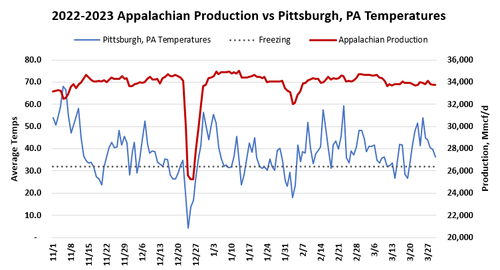 Appalachian gas production is going to fall substantially over the weekend, and that could push it to 30 Bcf/d or lower depending on what infrastructure is impacted during the event.