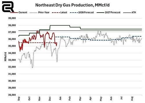The Appalachian production basin is poised for intense losses with the incoming winter storm. As volumes stand today at 35.5 Bcf/d, they have regained some of the last few days of freeze off losses but they are far shy of recent highs closer to 37 Bcf/d.