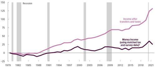 Cumulative Growth of Income Among Households in the Lowest Quintile of the Income Distribution, by Type of Income. (Congressional Budget Office, using data from the Census Bureau. In 2021 dollars. Shaded areas show recessions.) This is a prior release to the CBO report cited by the author, and includes many temporary COVID-era benefits not reflected in the most recent report.