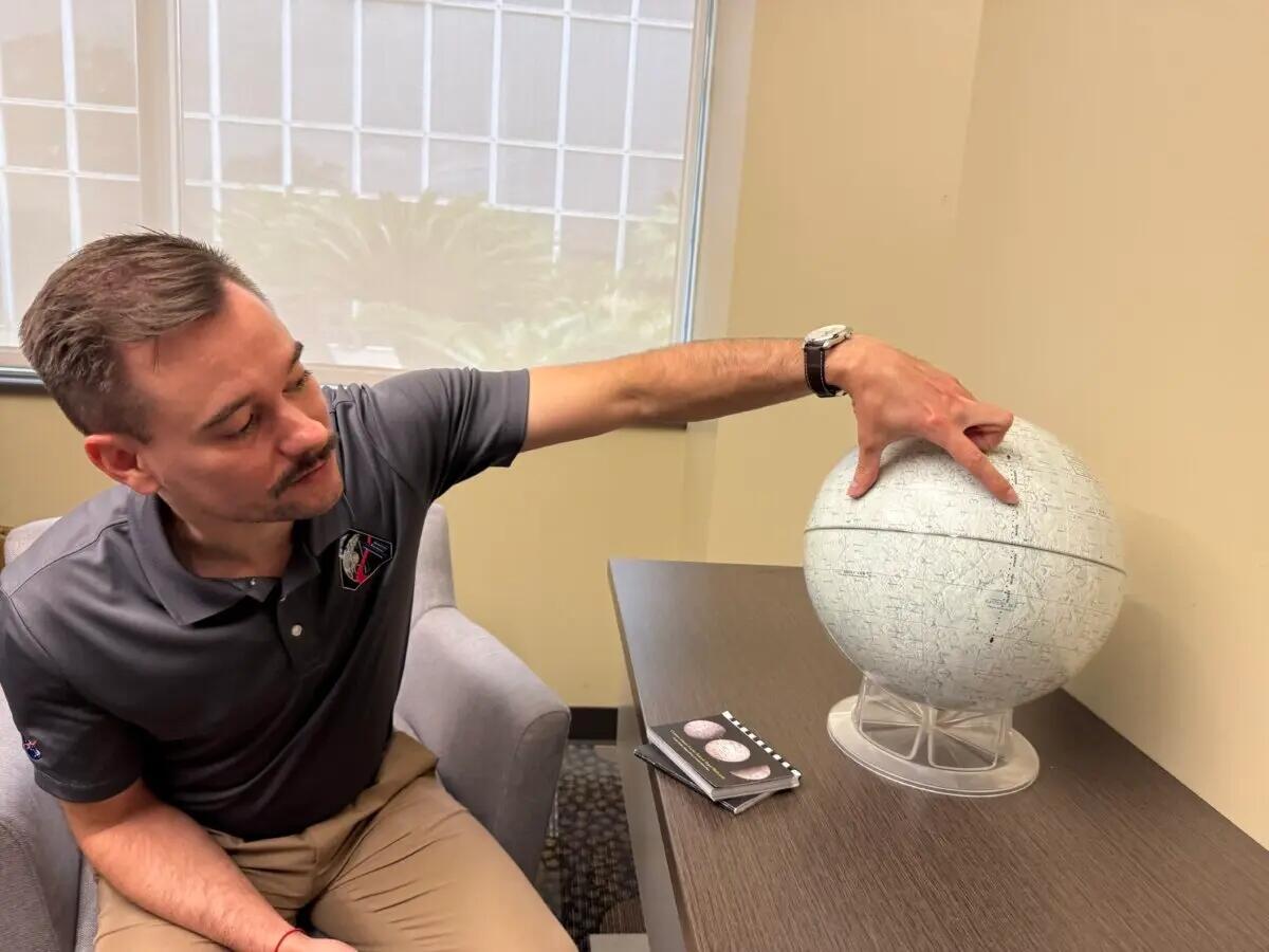 Jacob Richardson, Artemis II’s deputy lunar science lead, indicates roughly how much of the moon’s far side will be illuminated on April 5, 2026, ahead of Artemis II’s flyby. (T.J. Muscaro/The Epoch Times).