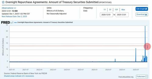 Liquidity has shifted significantly more favorably for risk assets and equities. On December 1, 2025, the Federal Reserve (Fed) officially ended its quantitative tightening (QT) program and is scheduled to cut overnight lending rates by another 0.25% next week. The Fed has simultaneously conducted a large overnight repurchase agreement injection of approximately $13.5 billion into the banking system, which is the second-largest liquidity injection since the COVID-19 era began.