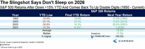 Statistically, there is also a bullish case to be made. As shown in the table below, many have forgotten about the ~20% decline we saw in March and April this year. That “reset” was necessary as 20% corrections, while they happen, are more “severe” events that reverse overly bullish sentiment and positioning. However, more notable was the sharp reversal from the April lows. Such a selloff and reversal has only occurred four times since 1950. While there is still roughly one month left in 2025, if returns hold at their current levels, it suggests that 2026 could have a positive year as bullish momentum continues.