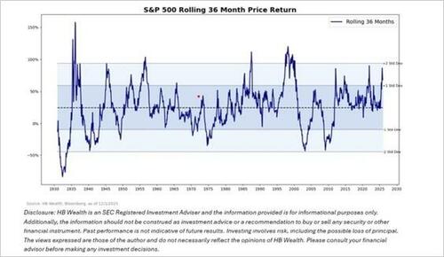 “The S&P 500 has posted a strong three-year price return of approximately 76.7 percent, excluding dividends. That translates to an annualized return of 20% to 22%. This is well above the long-term average annual return of roughly 10% to 11% with dividends reinvested. Such elevated returns over a short period suggest that the market is trading well above its historical trend. Historically, when the S&P 500 rolling 3-year return is two standard deviations above its three-year moving average, the market is statistically extended. This deviation typically precedes a shift in volatility and return outcomes. In other words, when markets reach this level of extension, two patterns emerge: increased volatility and weaker forward returns.”