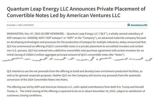This morning, just before the open, ASP Isotopes (ASPI) announced a private placement for convertible notes of their advanced materials subsidiary Quantum Leap Energy (QLE), in which investors would be none other than the Trump boys.