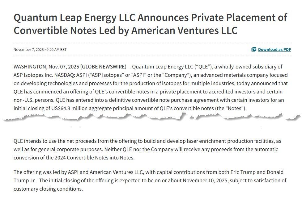 This morning, just before the open, ASP Isotopes (ASPI) announced a private placement for convertible notes of their advanced materials subsidiary Quantum Leap Energy (QLE), in which investors would be none other than the Trump boys.