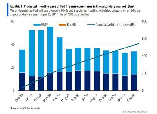 Earlier in the day, Barclays published a note estimating that the Fed could wind up buying close to $525 billion of T-bills in 2026 from a previous forecast of $345 billion, with net issuance to private investors estimated at just $220 billion from $400 billion previously.