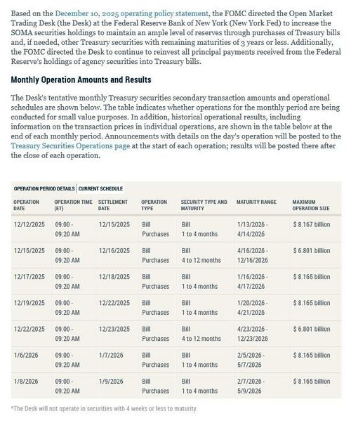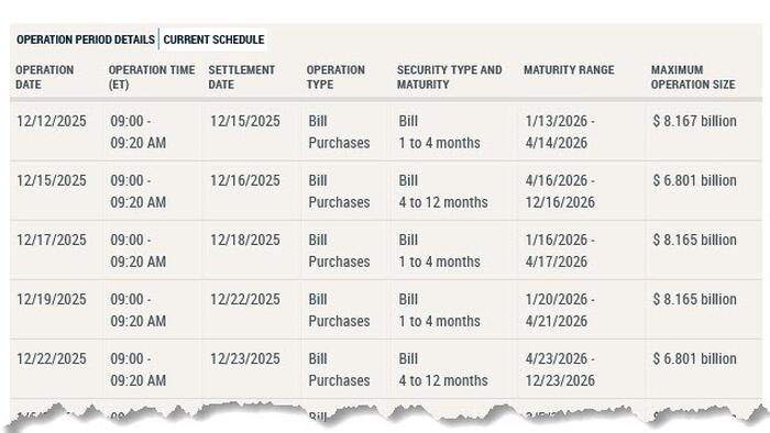 As shown in the schedule below and as was first announced yesterday, the Fed plans to buy $40 billion of T-bills, spanning two sectors, over the period beginning Dec. 12 and ending Jan. 14 for “reserve management purchases.” This includes $8.2 billion on Friday (full schedule here).