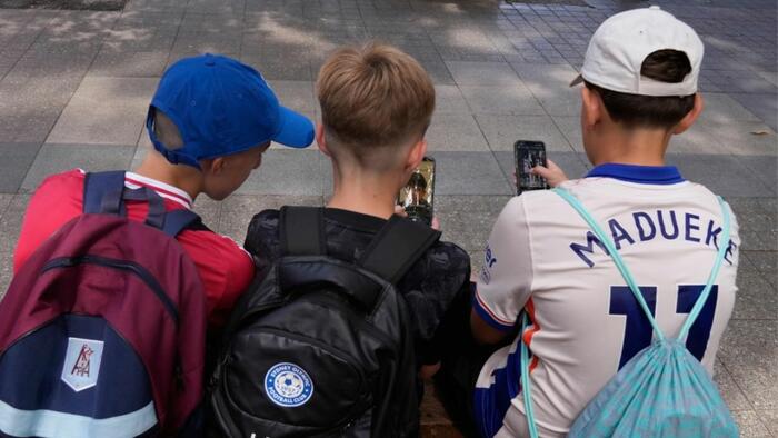 Three 11-year-old boys use their phones while sitting outside a school in Sydney on Dec. 8, 2025. Rick RycroftAP Photo