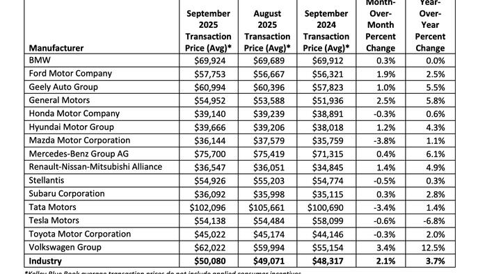 According to Kelley Blue Book (KBB), the average transaction price reached a record $50,080 in September, up 2.1% from August and 3.6% year over year—the largest annual increase in more than two years.