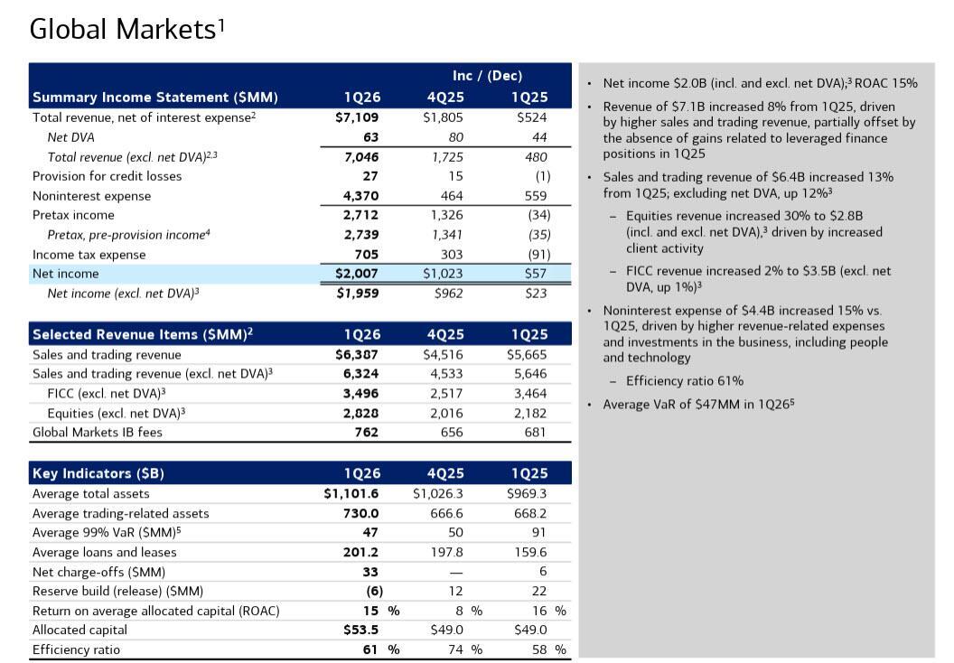 As an aside, noninterest expense of $4.4B increased 15% vs. 1Q25, driven by higher revenue-related expenses and investments in the business, including people and technology. Lastly, average Q1 VaR tumbled to just $47MM in 1Q26 as even trading desks retrenched.