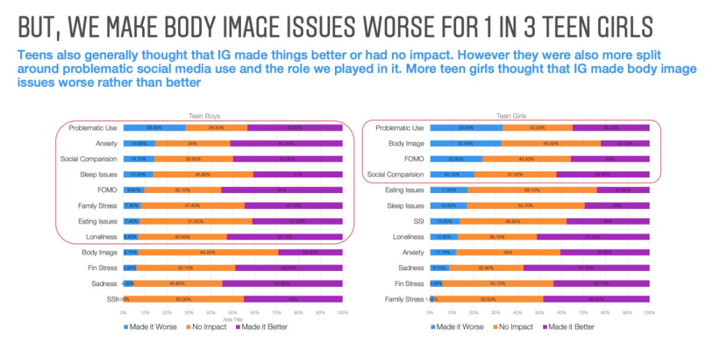 Except… that’s very much out of context. Here’s how misleading Reed’s characterization is. The actual internal research Haugen leaked—the stuff Reed claims shows Facebook “knew about the harms”—looked like this: