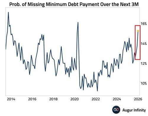And, the most important debt to everyday Americans, credit card debt, is seeing delinquency rates surge to levels last seen in 2011. Household debt rocketed by $197 billion in the 3rd quarter, reaching an astronomical $18.6 trillion. Nothing like a record amount of debt, a weakening frozen jobs market, and now Trump’s 10% interest rate cap PR stunt to create a consumer debt crisis. It has already begun. US consumers now see a 15.3% chance of missing a minimum debt payment over the next 3 months, the highest since April 2020. This is also the 2nd-highest reading since the 2013 peak.