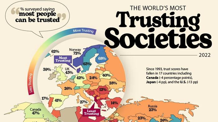 The infographic below, via Visual Capitalist’s Pallavi Rao, ranks 90 economies by the share of adults who agree that “most people can be trusted,” using nationally representative survey data from 2022, published 2024.