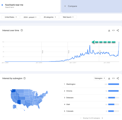 In the meantime, Google Search trends show “food bank near me” surged above Covid panic highs as those who rely heavily on the federal government to survive scramble for food.