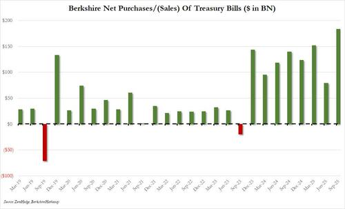 And since Berkshire isn’t buying either others shares, or its own, it had to park all this record cash somewhere; and once again it did so by buying a record $183 billion (net) in treasuries in the quarter, bringing total purchases during the past 12 months to a record $540 billion.