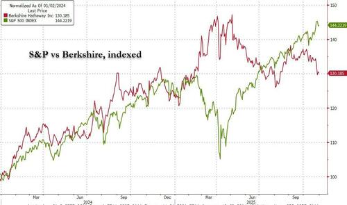 And indeed, it’s not just Berkshire that has not been buying back its own stock: investors have voted their apprehension about Berkshire’s outlook and pending management change by selling its stock. Since Buffett announced on May 3 he would step down, Berkshire’s stock price has fallen 12%, and trailed the S&P by 32%. For all of 2025, Berkshire is 11% points behind the index.