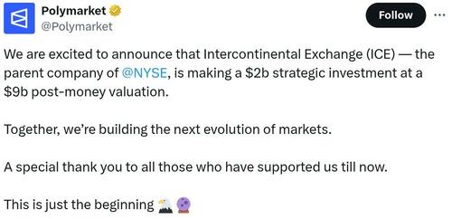 We’re proud to announce that $ICE, the owner of @NYSE and the largest exchange company in the world, is making a strategic investment of $2 billion into Polymarket, valuing us at $9 billion post-money.