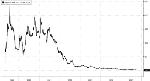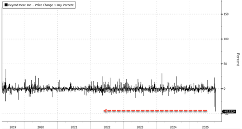 Fake food company Beyond Meat (NASDAQ: BYND) crashed the most on record today after it announced that nearly all creditors agreed to a debt-swap deal that massively dilutes equity shareholders.