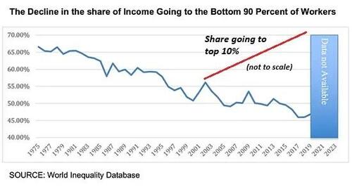 Here is the share of income going to the top 10%–up (for illustrative purposes, not to scale)–and the share going to the bottom 90%: down.