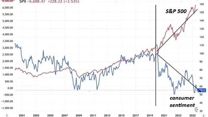 Here is the S&P 500 (SPX) stock market index, representing the wealth of corporations and the top 10% who own their shares, rising at a 45-degree angle, and consumer sentiment, representing the real-world economy, sliding down a 45-degree angle.