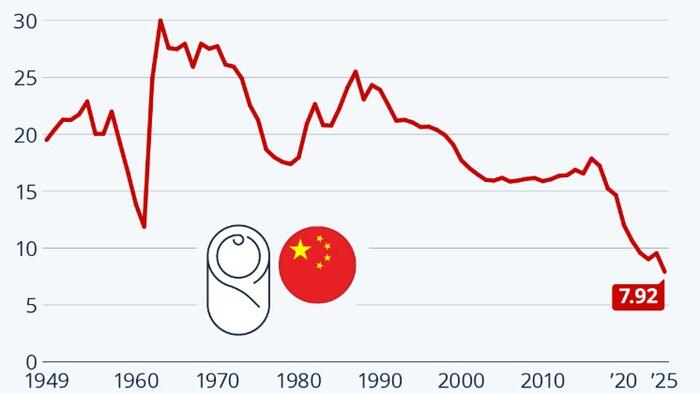 The number of new babies born in China dropped to 7.9 million in 2025, the lowest number in more than seven decades.