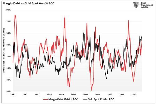 Re-read that last sentence from the BIS. For investors with invested capital, this matters deeply. While many are chasing gold and precious metals like silver higher, along with high-risk equities, leverage, and speculative trading activities, this is essentially a function of momentum chasing. This is illustrated in the chart below, which shows the annual rate of change in margin debt (leverage) alongside the annual rate of change in both equities and silver.