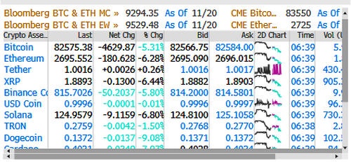 BTC dropped as much as 6% early Friday to $81,569, while Ether and smaller tokens plunged into the abyss as risk-off sentiment hit both crypto and equity futures (market wrap). Bitcoin is now down roughly 25% for the month.