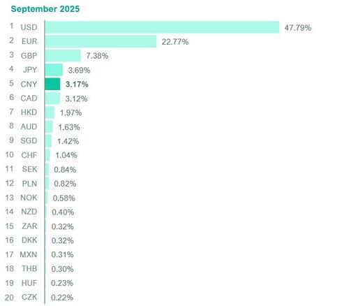 Data from SWIFT, the largest international payments network, shows the US dollar accounted for 47.8% of international trade as of September 2025, followed by the euro and British pound at 22.8% and 7.4%, respectively.