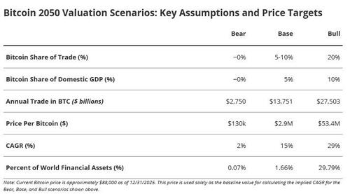 Sigel and Bush estimated that central banks could hold 2.5% of their assets in Bitcoin, while a $2.9 million price would imply that Bitcoin represents 1.66% of the world’s financial assets.