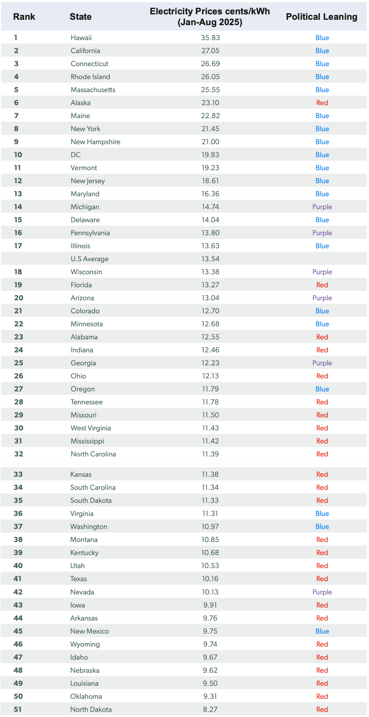 The data is clear: bluer states tend to have much higher electricity prices than red states.