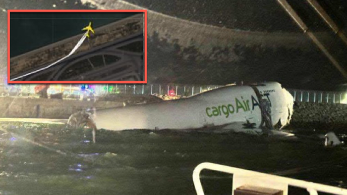 “A cargo plane arriving from Dubai ran off the runway and tumbled into the sea at Hong Kong International Airport early Monday, crashing into a ground-service vehicle and leaving two workers missing. Sources said the freighter struck a ground-service vehicle, shearing off one of its wheels, before coming to rest with its nose over the seawall. The four crew members on board escaped unhurt, but two ground staff inside the vehicle remain missing.”
