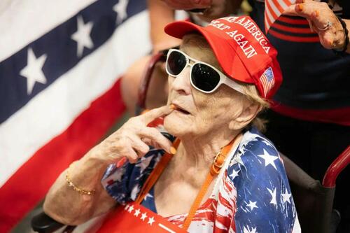 100-year-old Vee Duurloo attends a rally for presidential candidate Donald Trump in Prescott Valley, Ariz., on Oct. 13, 2024. John Fredricks/The Epoch Times
