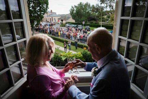 A 100-year-old American World War II veteran, Harold Terens, and his 96-year-old bride, Jeanne Swerlin Terens, toast each other with glasses of champagne after their wedding at the Carentan-les-Marais Town Hall in Carentan-les-Marais, France, on June 8, 2024. Win McNamee/Getty Images