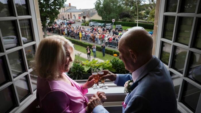 A 100-year-old American World War II veteran, Harold Terens, and his 96-year-old bride, Jeanne Swerlin Terens, toast each other with glasses of champagne after their wedding at the Carentan-les-Marais Town Hall in Carentan-les-Marais, France, on June 8, 2024. Win McNamee/Getty Images