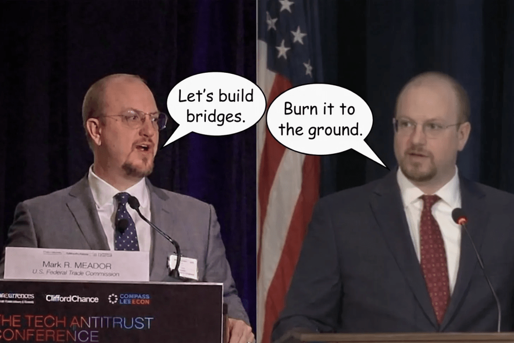 Which brings me to my real objection to Meador’s appearance. In Palo Alto, he was mild, reasonable, even conciliatory. The speech itself was a little misguided but pleasant enough. The problem was what it concealed: the other Mark Meador, and the other FTC.