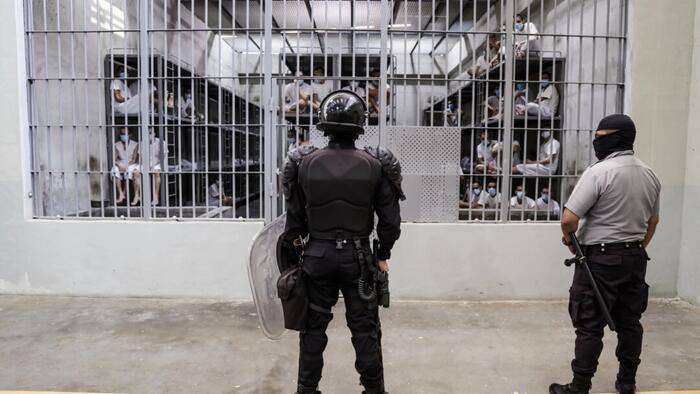 Guards stand outside a cell block at the Center for Terrorism Confinement (CECOT) in Tecoluca, El Salvador, on April 4, 2025. Alex Peña/Getty Images