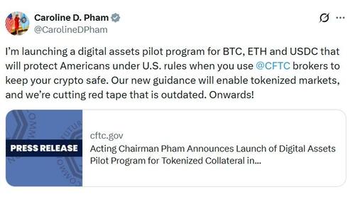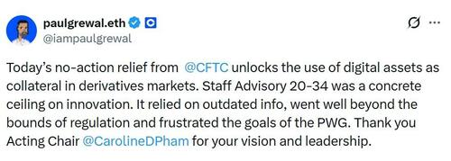 Pham said in an X post on Monday that the “guidance provides regulatory clarity and opens the door for more digital assets to be added as collateral by exchanges and brokers, in addition to US Treasurys and money market funds.”