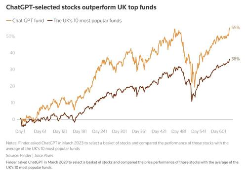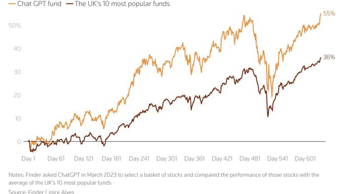 Finder found that 40% of UK respondents had used AI for personal finance. Its own experiment with ChatGPT stock picks in 2023 produced a basket including Nvidia, Amazon, Procter & Gamble and Walmart, which gained 55%—far ahead of leading UK funds.