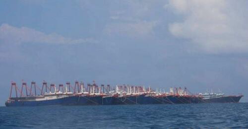 Some of a total of 220 Chinese vessels are moored at Whitsun Reef, South China Sea on March 7, 2021. Philippine Coast Guard/National Task Force-West Philippine Sea via AP