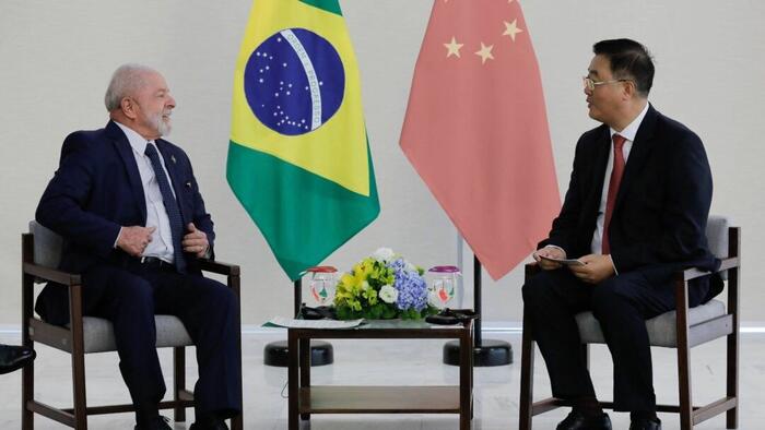 Brazilian President Luiz Inácio Lula da Silva (L) talks to Chinese Ambassador to Brazil Zhu Qingqiao at the Palacio do Planalto in Brasilia on Feb. 3, 2023. Sergio Lima/AFP via Getty Images
