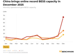 China’s December additions of 65 gigawatt hours of battery storage made up 92% of the 71-gigawatt hours that came online worldwide in the final month of 2025. For the entire 2025 year, over 246 gigawatt hours of grid-scale battery storage came online, of which 66% was installed in China, 19% in the United States, and 4% in Europe. The 246-gigawatt hours were a 46% increase over 2024 battery storage installations.