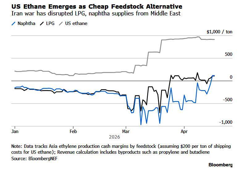 That’s because with the Iran war choking off traditional – and crucial – supplies, China is set to import a record volume of US ethane this month as petrochemical producers desperately seek alternative feedstocks for their operations.