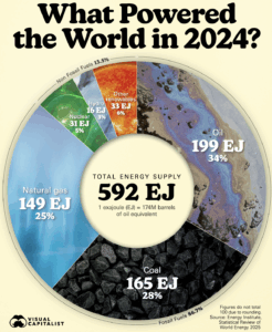 As reported by Visual Capitalist, last year, fossil fuels supplied 86.7% of global energy needs, led by oil with a 33.6% share, followed by coal with a 27.9% share, and natural gas with a 25.2% share. Global energy demand increased 2% to reach an all-time high of 592 exajoules in 2024. Non-fossil fuels grew 7%, bringing their share of the global energy mix to 13.5%.