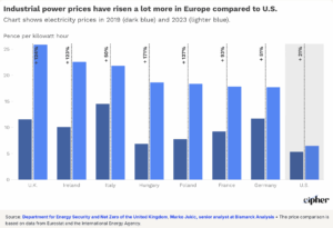 Europe’s transition to “clean” energy has resulted in skyrocketing energy prices, far higher than those in the United States. Their green policies have caused energy prices to rise two to three times faster in Germany and other Eurozone nations than in America (see chart below).