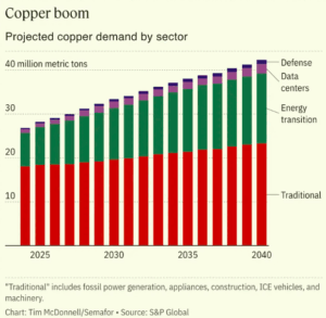 Via Semafor, although China dominates refined copper processing, global output is expected to become increasingly diversified, with about 55% of refined production forecast to come from outside China by 2030. Copper underpins modern economies, used in everything from consumer electronics and household appliances to electric vehicle batteries, artificial intelligence data centers, military drones, and construction and wiring. Supply is tightening as new mines are slow and costly to develop, while existing operations face rising costs as ore grades deteriorate. The market is already undersupplied, a problem compounded in 2025 when several of the world’s largest mines were temporarily shut by mudslides, earthquakes, and tunnel collapses. Analysts warn the supply gap could widen to as much as 10 million metric tons — roughly a quarter of projected demand — by 2040, keeping prices elevated. To ease shortages, governments will need to accelerate mine development, expand recycling, and broker new trade arrangements between producers, processors, and end users; the Trump administration has moved to encourage more U.S. mining, but results will take years to materialize.