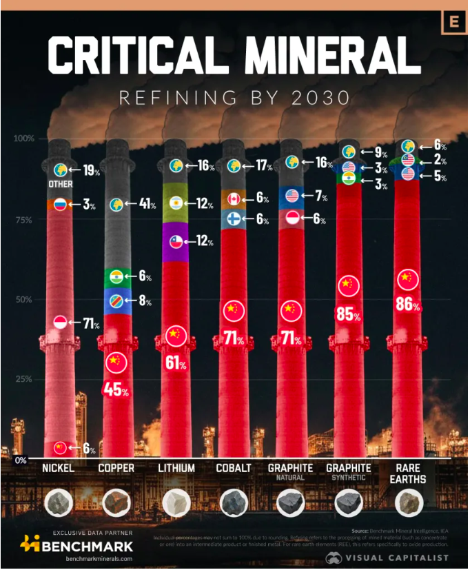 China remains the dominant refined mineral supplier, both in terms of country of origin and overseas Chinese corporate-owned supply, as China has spent decades developing the industry. According to the Epoch Times, China controls about 90% of global capacity for the processing, smelting, and separation of these materials, as well as for the manufacturing of magnetic materials. While the United States, Australia, Brazil, India, and parts of Africa are establishing new mines, most of their concentrates still have to be shipped to Chinese refineries, where the country processes them with cheap coal power and lax environmental and other standards.