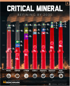 China’s dominance with regard to refined critical mineral supply is expected to continue through the end of the decade. It is expected to have a market share of over 80% in both rare earths and synthetic graphite. Despite the Trump Administration’s focus on onshoring critical mineral refining and processing, the United States is expected to gain only relatively small market shares in the natural and synthetic graphite and rare earth markets. Canada and Finland will each account for 6% of the refined cobalt production.