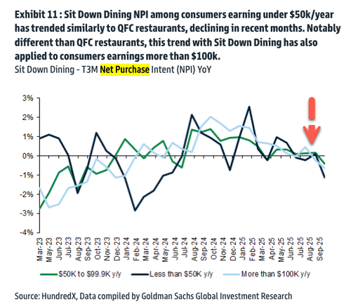 Shares of Chipotle Mexican Grill plunged in premarket trading after the company slashed its full-year sales outlook for the third time this year, now forecasting a low single-digit decline from the previous reporting year instead of flat growth. The downgrade reflects a clear pullback in discretionary dining behavior this fall, as working-class consumers tighten budgets amid mounting economic pressures. None of this should come as a surprise, as we cautioned in our note last week, “Low-Income Consumers Pulling Back on Restaurant Spending May Signal Trouble Ahead.”