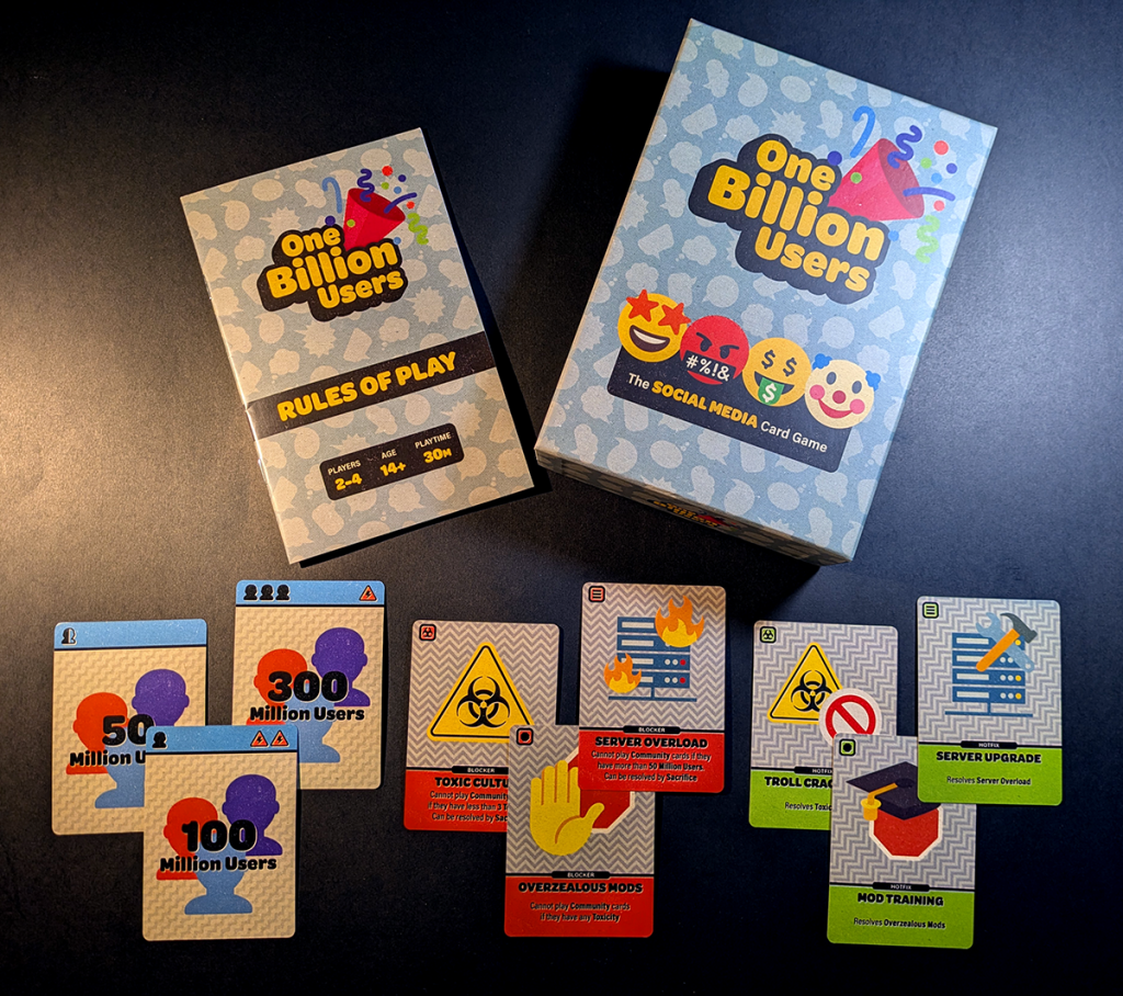 A couple months ago we offered up the few remaining copies of our social media card game, One Billion Users, after fulfilling orders from our Kickstarter backers. Quite a few of you took the chance to snag one, and now we’re down to an extremely small number remaining: at time of writing, we only have ten undamaged copies of the game, and a few dozen of the damaged copies that we are offering at a deeper discount.
